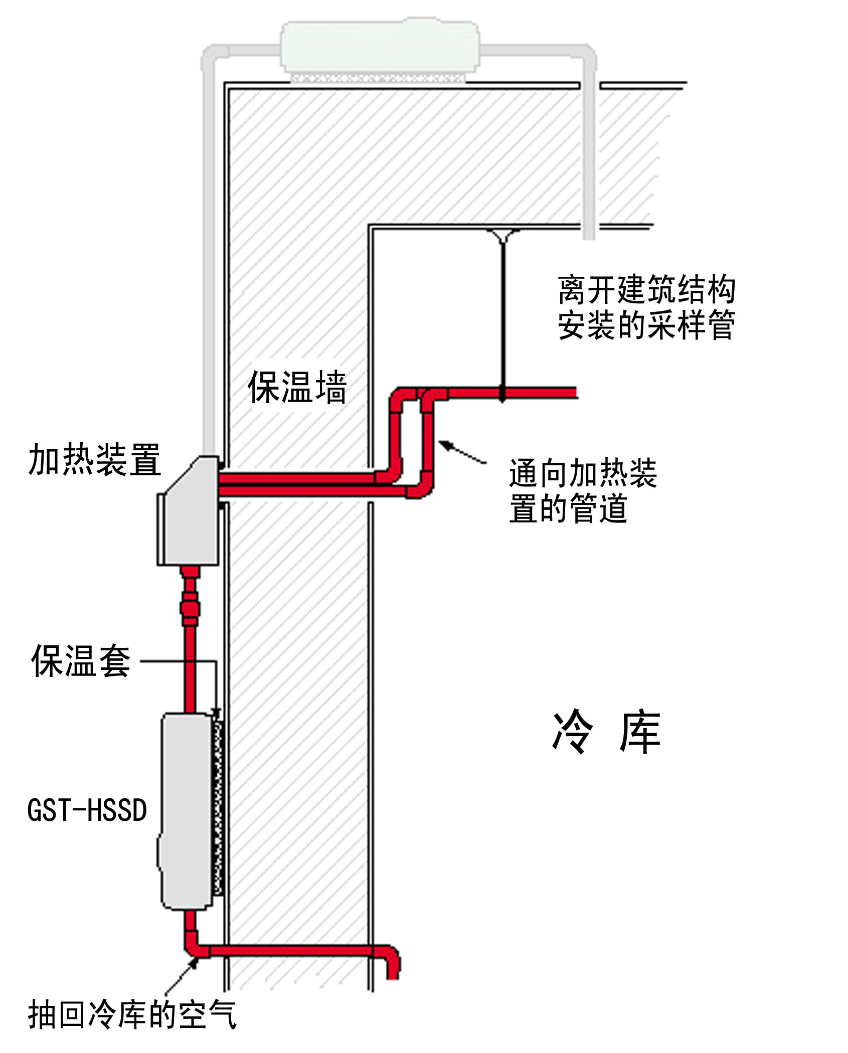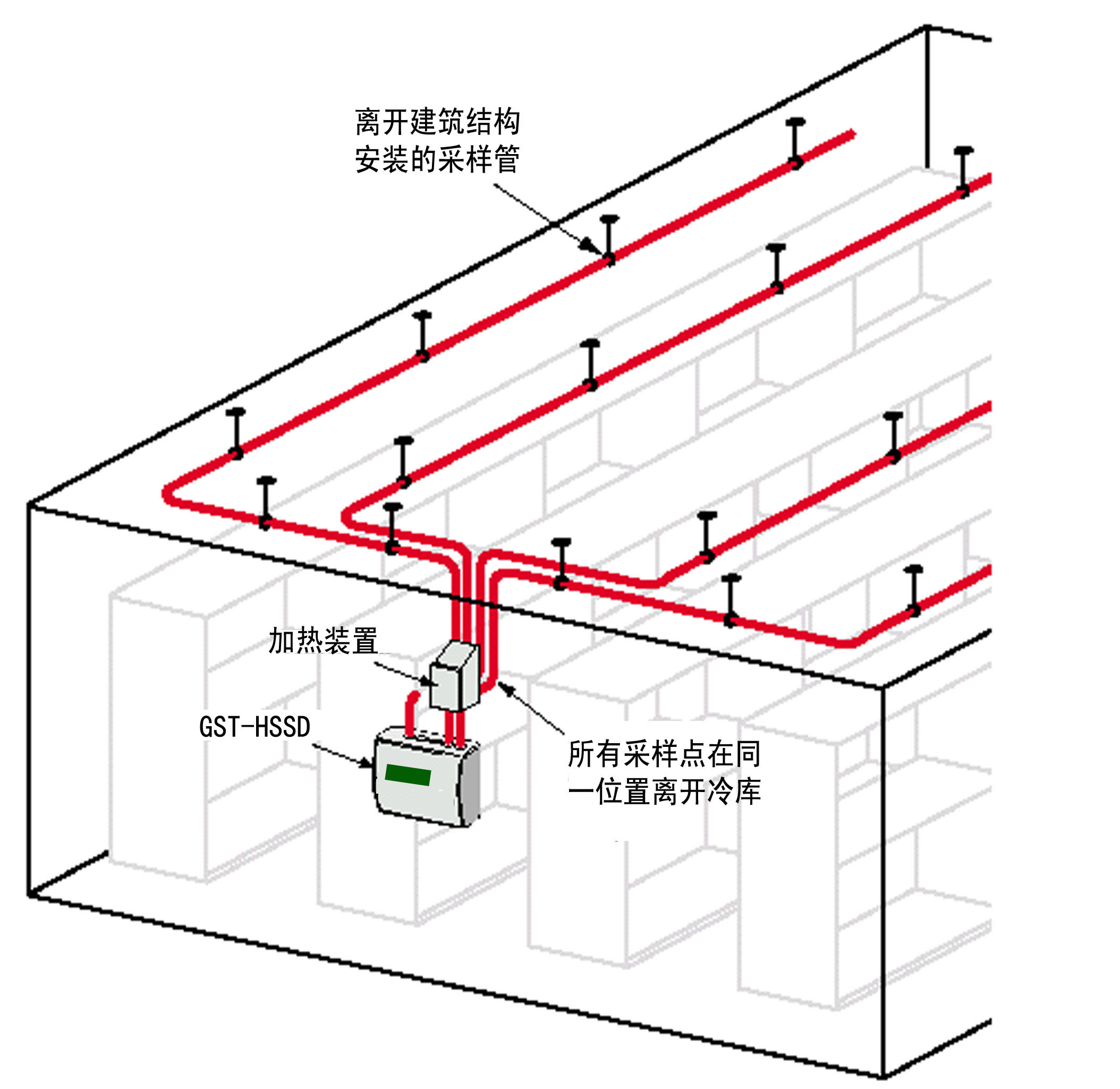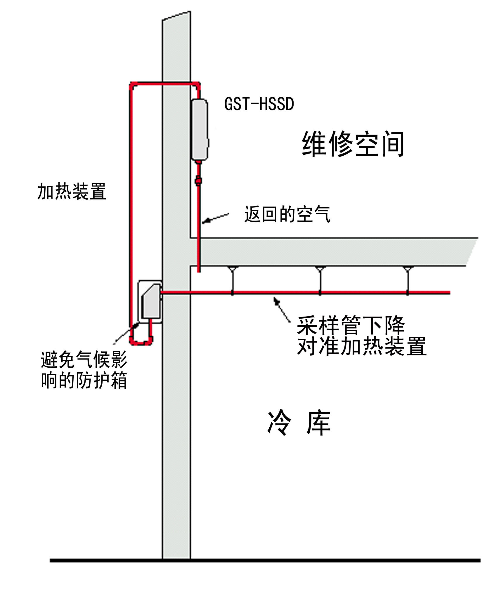 冷庫(kù)中采樣管,加熱箱和吸氣式感煙火災(zāi)探測(cè)器的相對(duì)位置